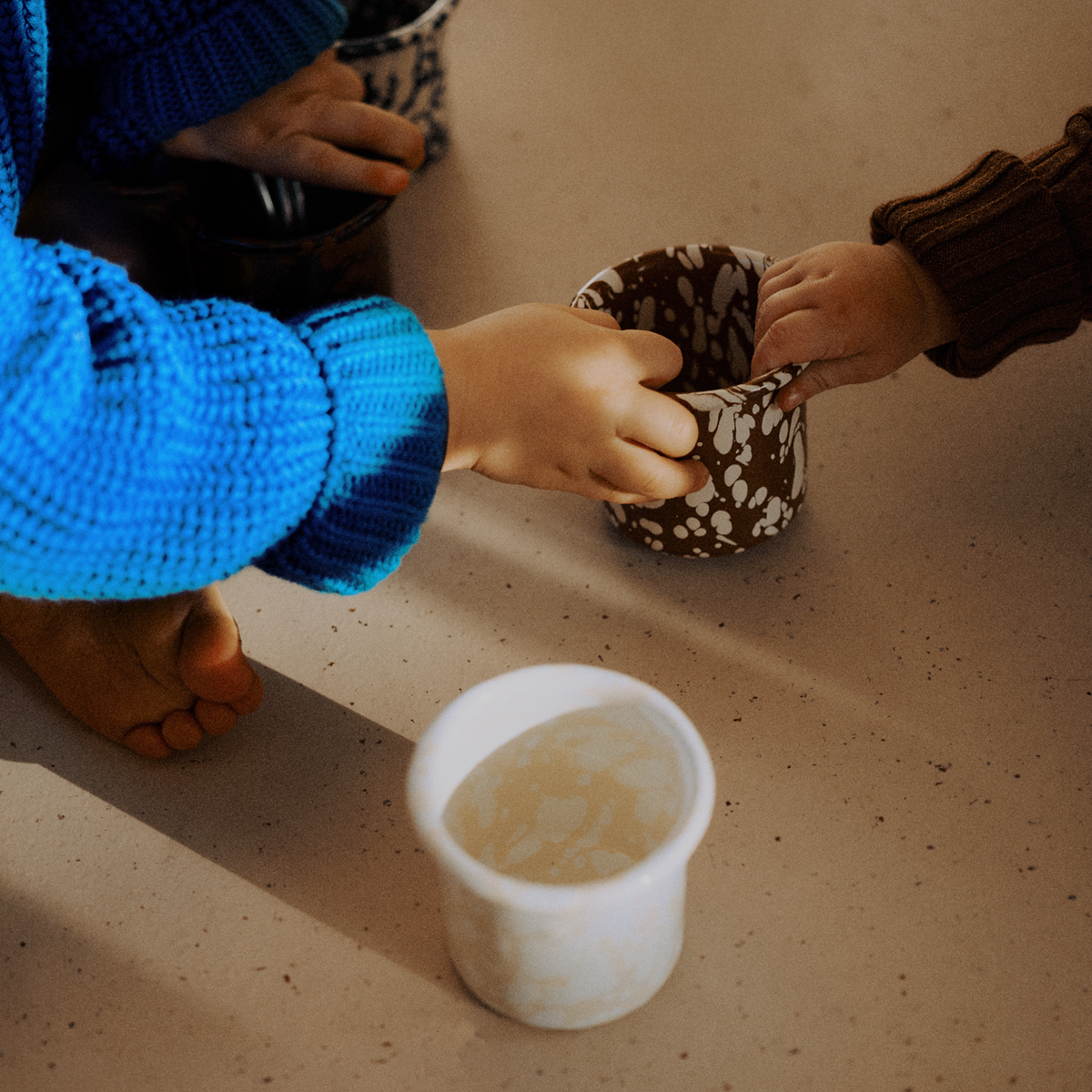 Auf der Suche nach einer besseren Lösung sind wir über Grosis alten Emaillekrug gestolpert. Ein Objekt, das Jahrzehnte überstanden hat, ohne Giftstoffe, ohne Schnickschnack: Stahlkern, Glasbeschichtung, gebrannt im Ofen. Robust, geschmacksecht, multifunktional – und ehrlicher als alles was wir hatten. Diese Einfachheit hat uns inspiriert und mit der Geburt unseres zweiten Sohnes 2025 haben wir entschieden: Wir bringen Emaille zurück auf den Tisch.